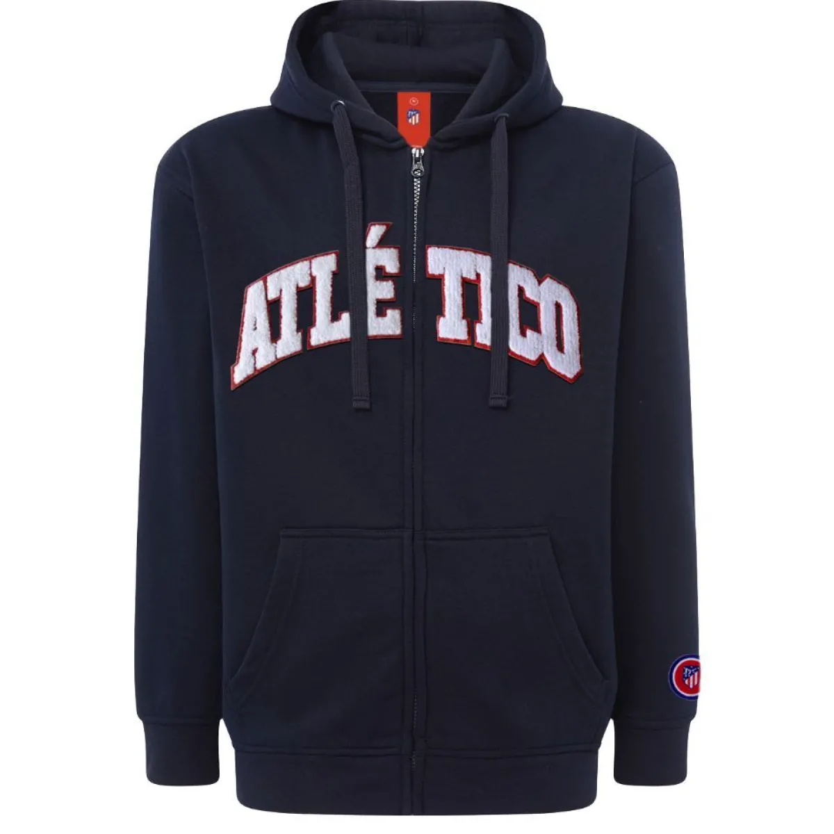 Chaqueta de niño con cremallera central en color azul marinocon el naming ‘Atlético’ en color blanco y tacto aterciopelado.