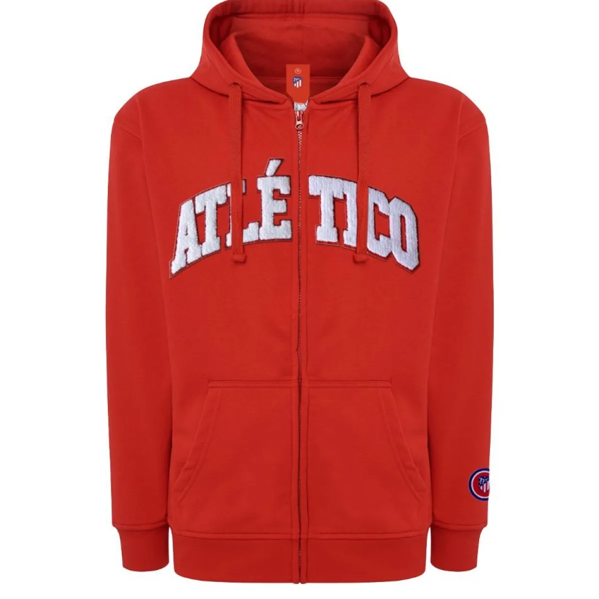 Chaqueta de niño con cremallera central en color rojocon el naming ‘Atlético’ en color blanco y tacto aterciopelado.