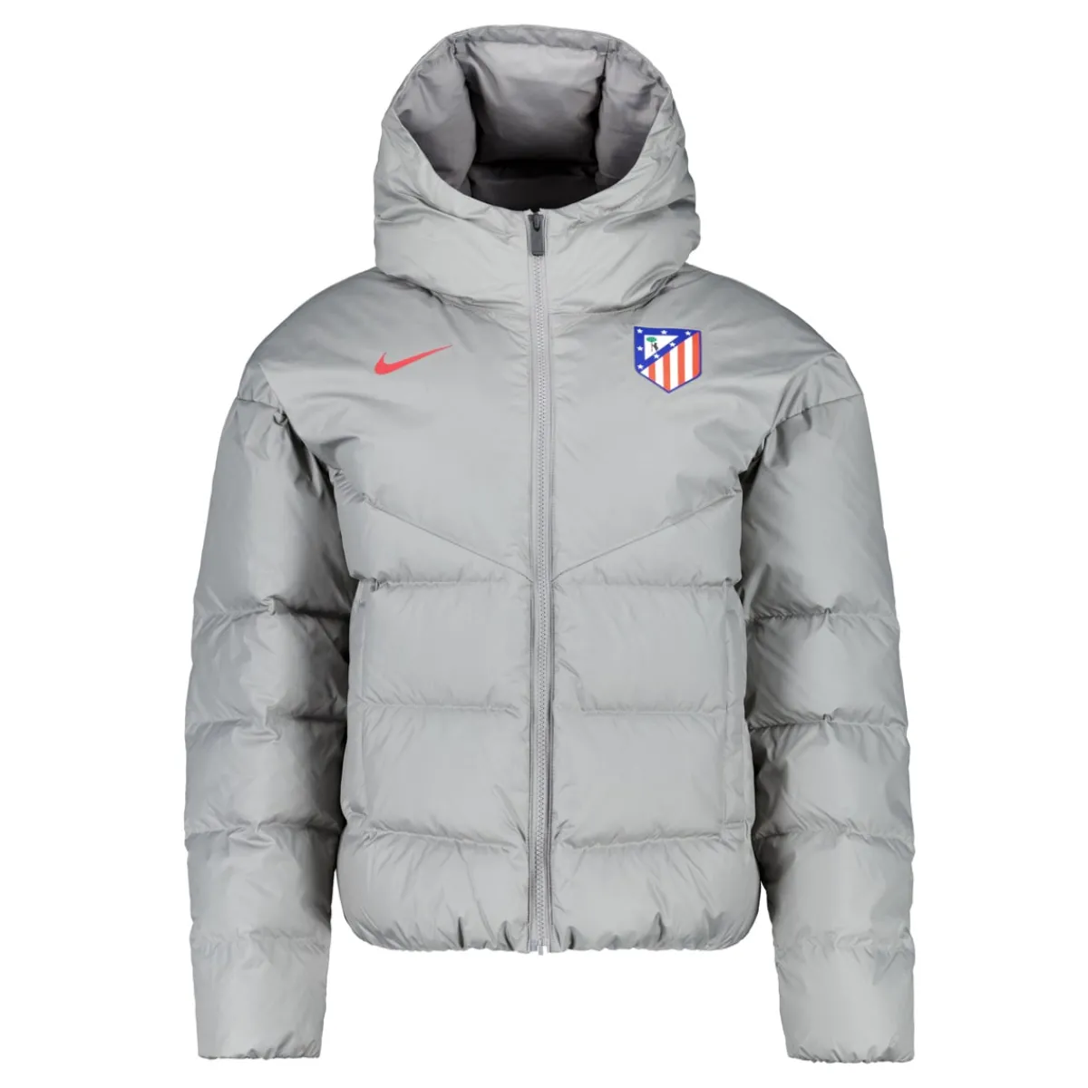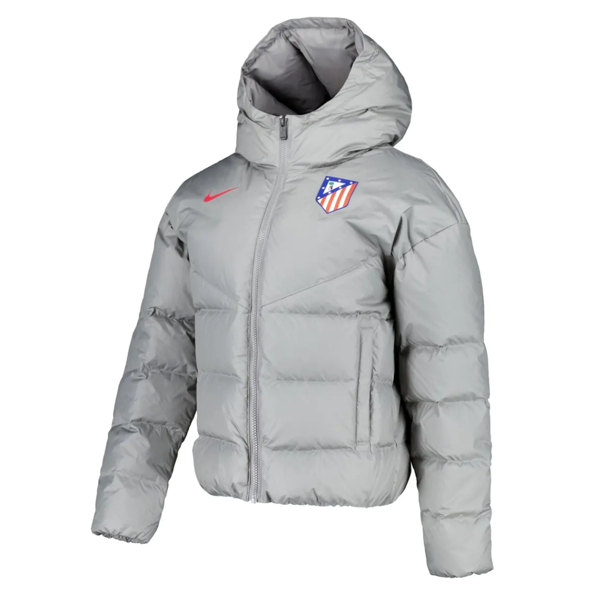 Diseñado por Nike, este abrigo corto de color gris destaca por su diseño moderno y deportivo, reflejando la esencia del Atlético de Madrid con detalles sutiles que realzan tu pasión por el club.