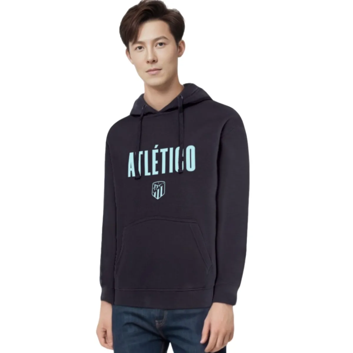 Sudadera clásicade adulto en color azul marino con el naming Atlético y elescudo del equipo en color azul celeste.