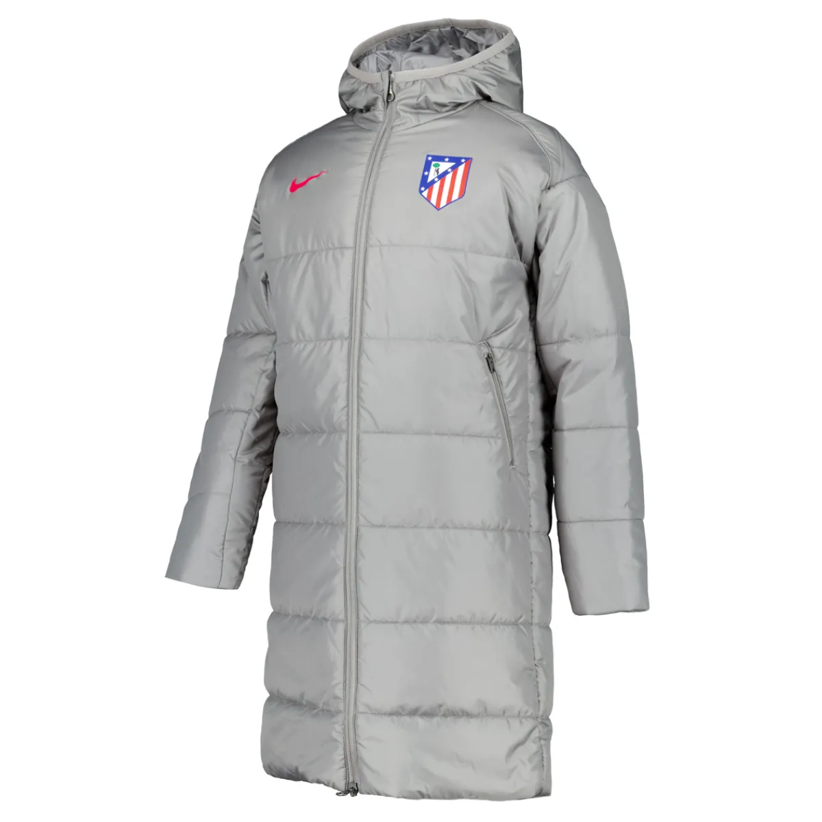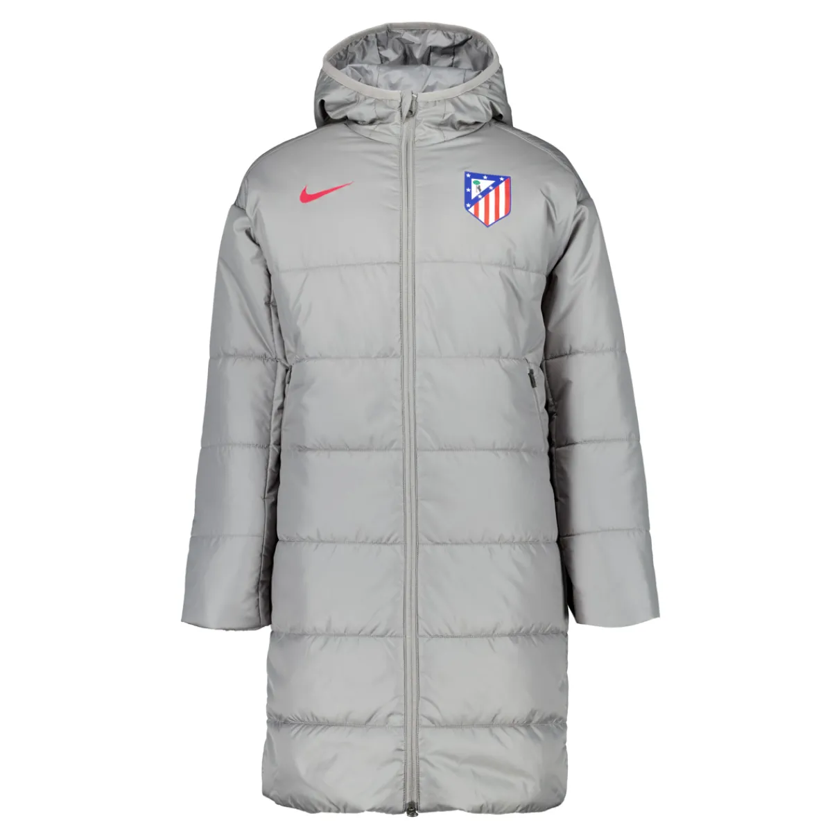 Diseñado por Nike y con los colores representativos del Atlético de Madrid, este abrigo gris destaca por su diseño moderno y deportivo.