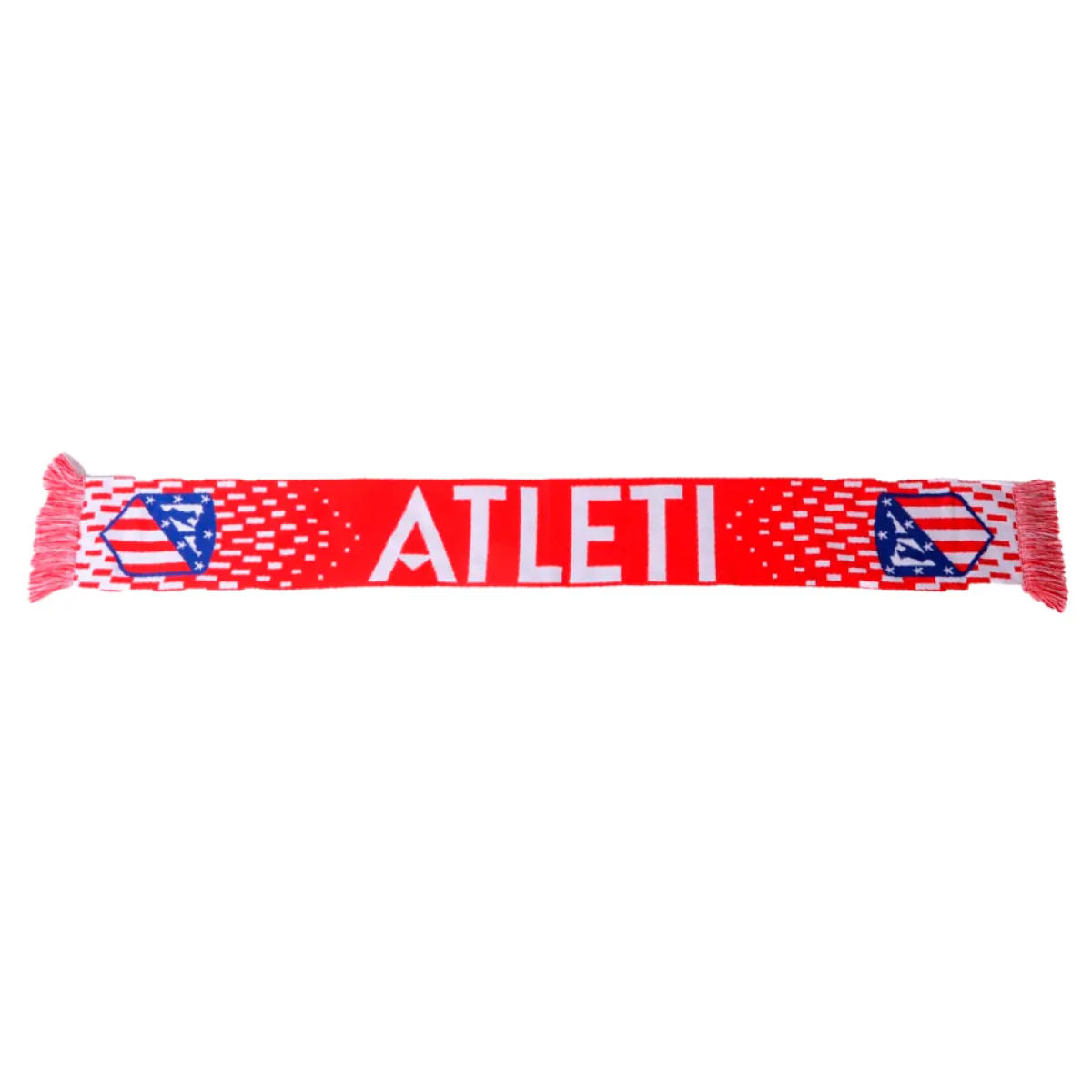 Bufanda roja con degradado en los extremos y ‘ATLETI’ en el centro.