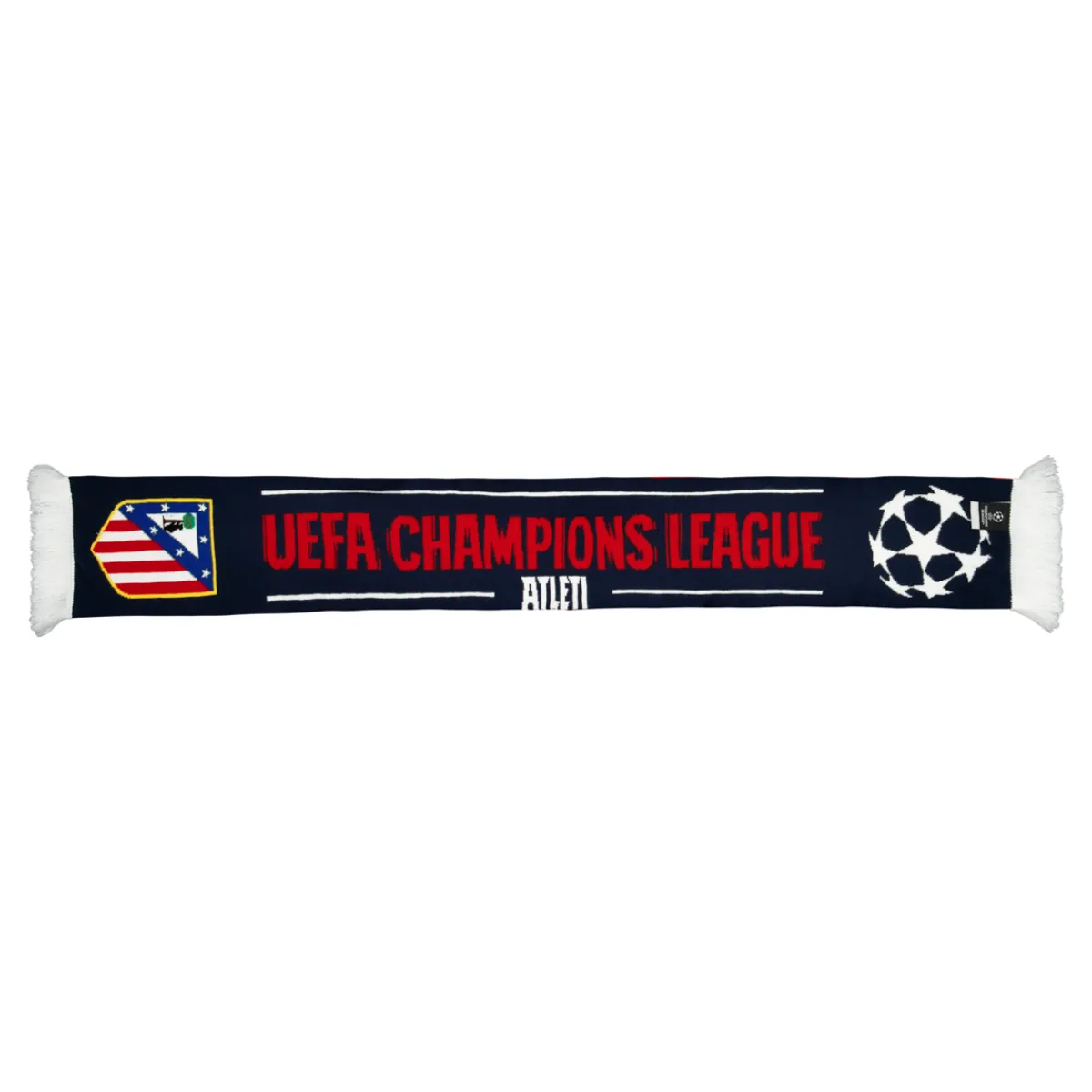 Esta bufanda, en un vibrante color rojo, es un homenaje a la imponente presencia del Atlético de Madrid en la UEFA Champions League.