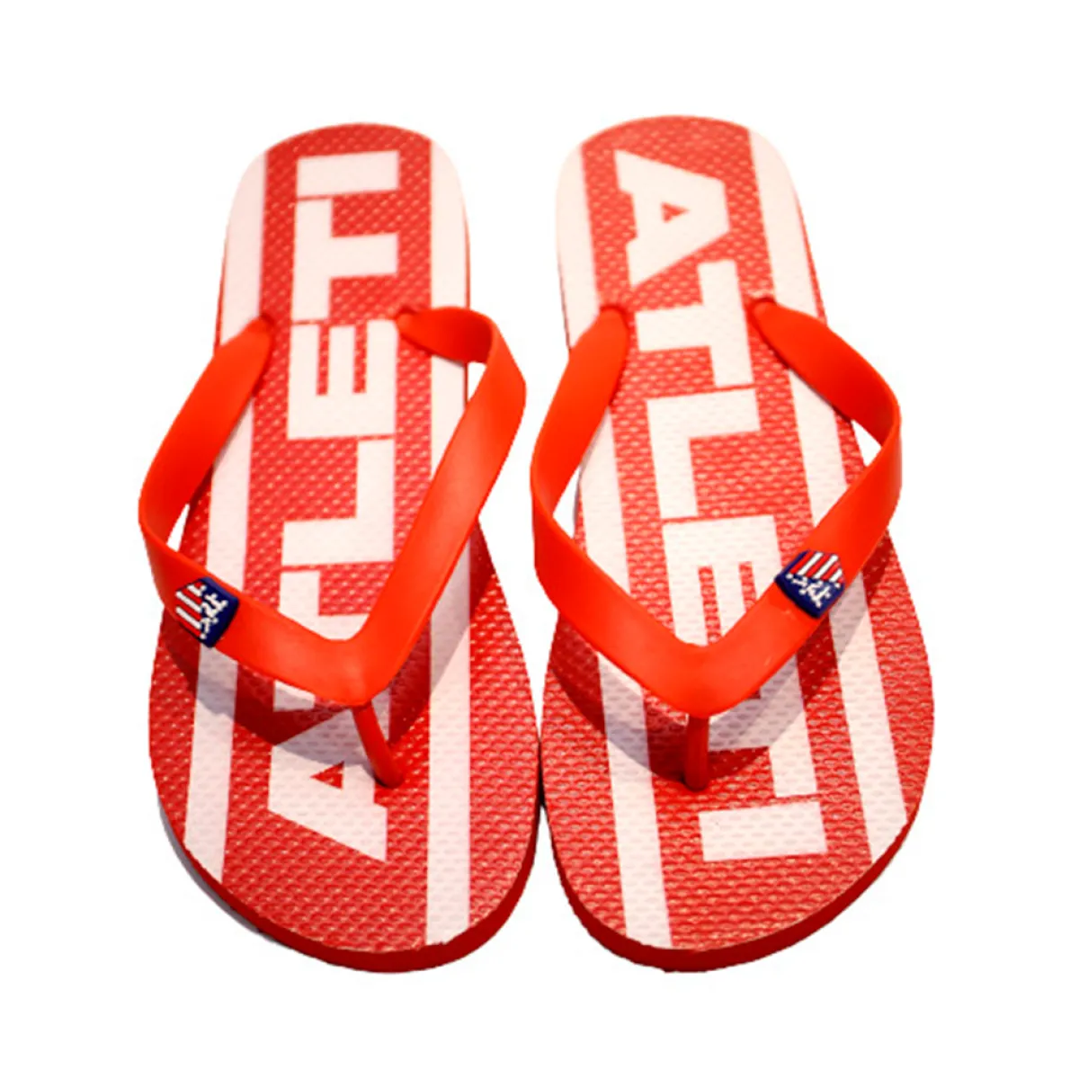 Chanclas rojiblancas de niño con el naming ‘Atleti’ en blanco y escudo en relieve, perfectas para disfrutar del verano.