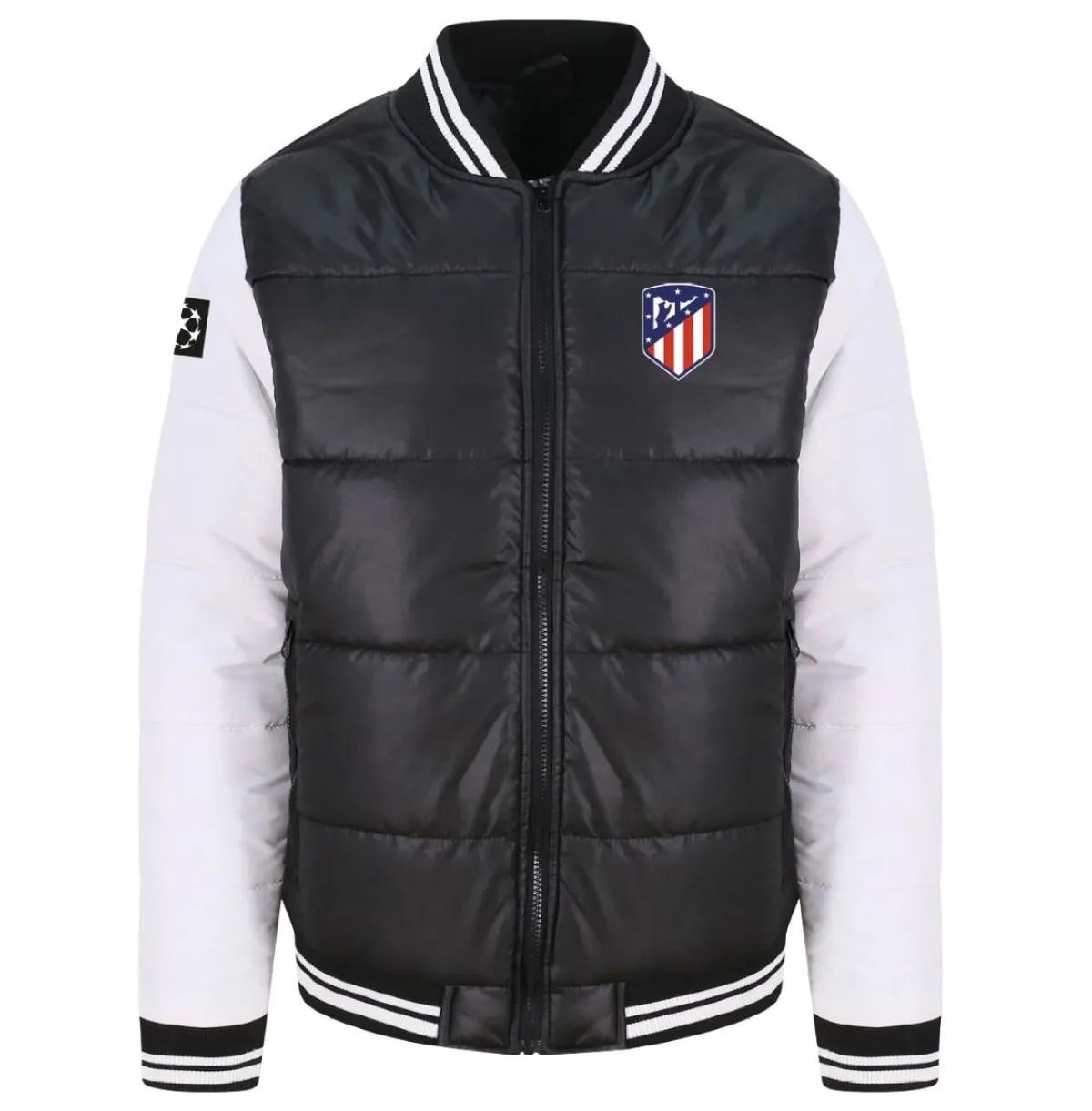 Chaqueta acolchada del Atlético de Madrid de la gama UEFA Champions League. Torso en color negro y mangas y detalles en blanco.