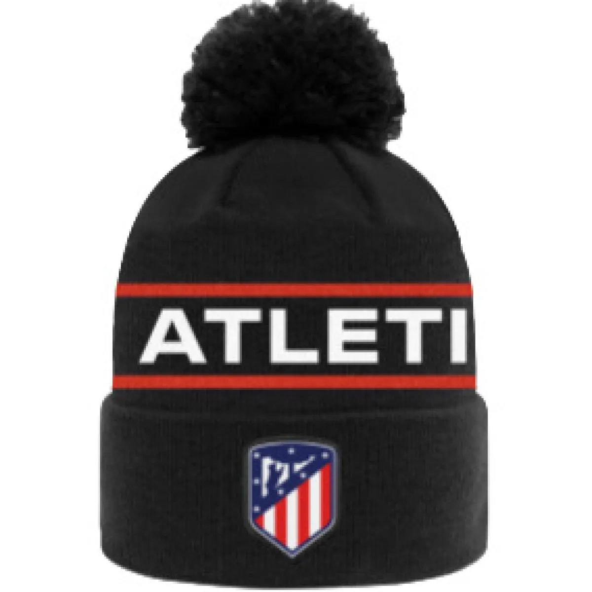 Gorro en color negrocon el naming ‘Atleti’, pompón en la parte superior y el escudo del Atlético de Madrid bordado.