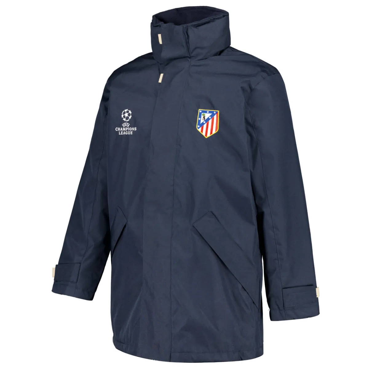 Con un diseño funcional y moderno, esta parca combina estilo y confort, destacando el escudo del Atlético de Madrid y el logo de la UEFA Champions League bordados, lo que la convierte en una prenda única para cualquier fanático del Atleti.